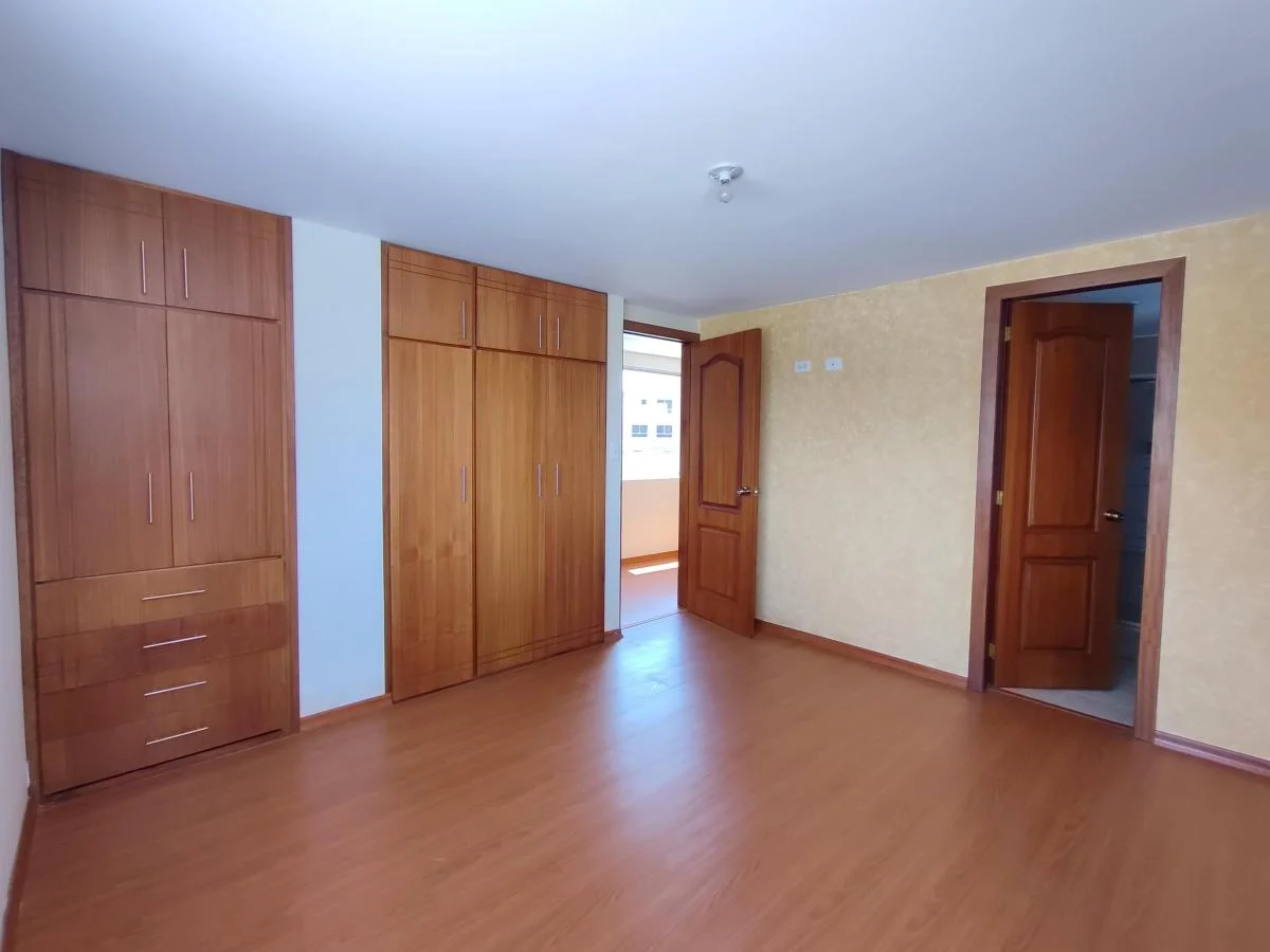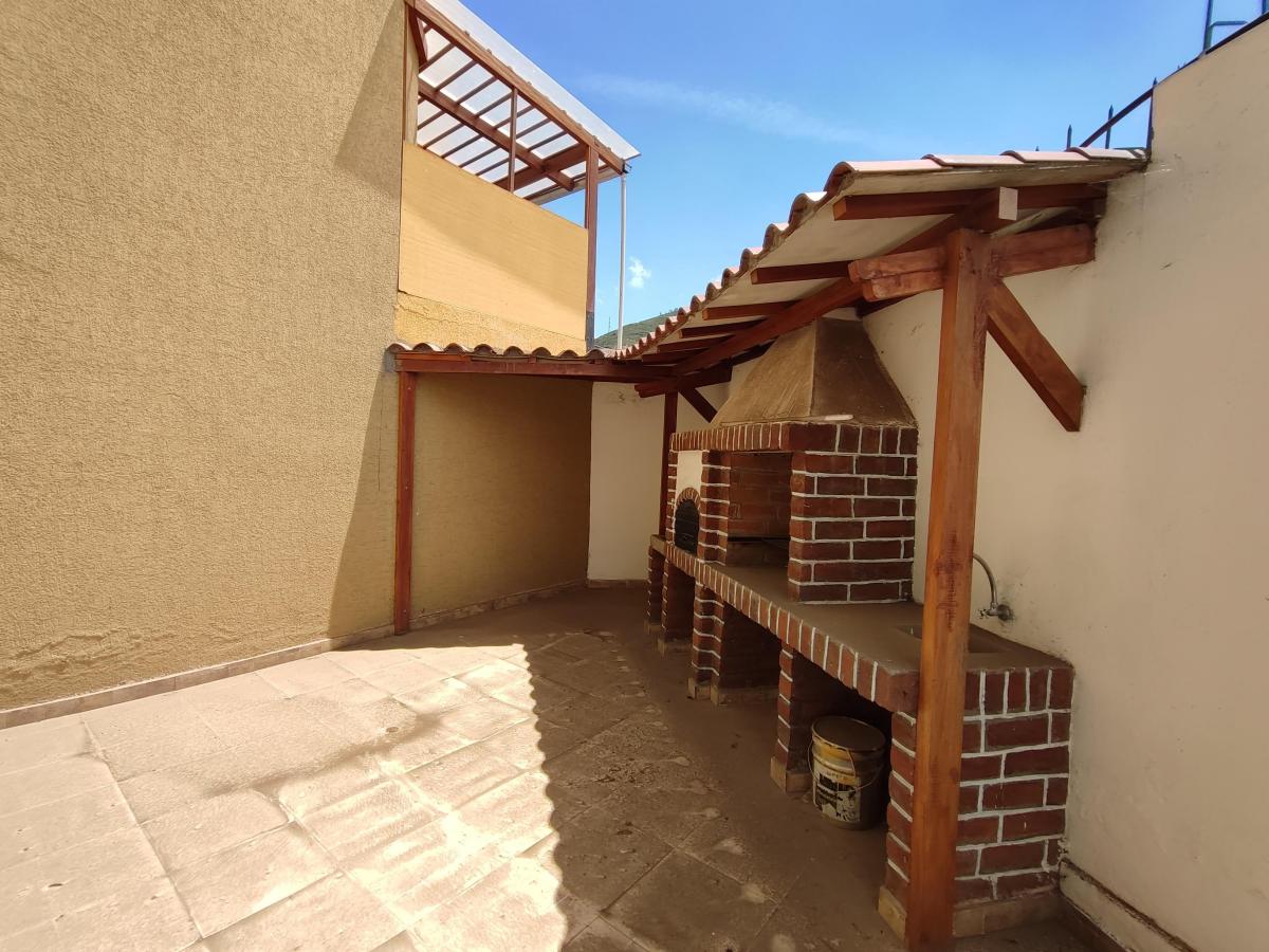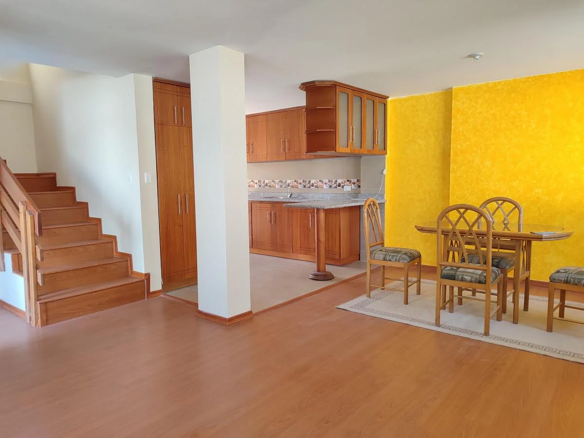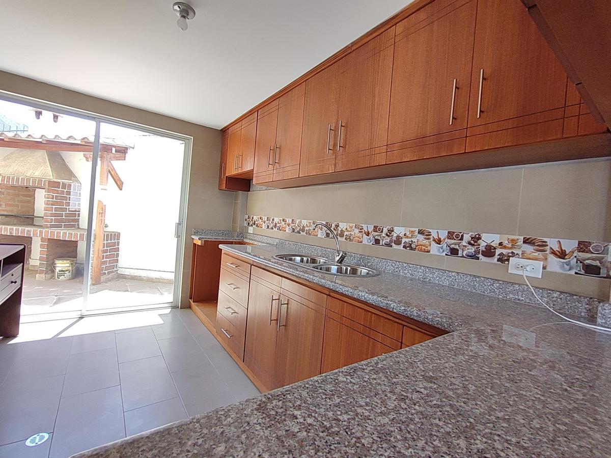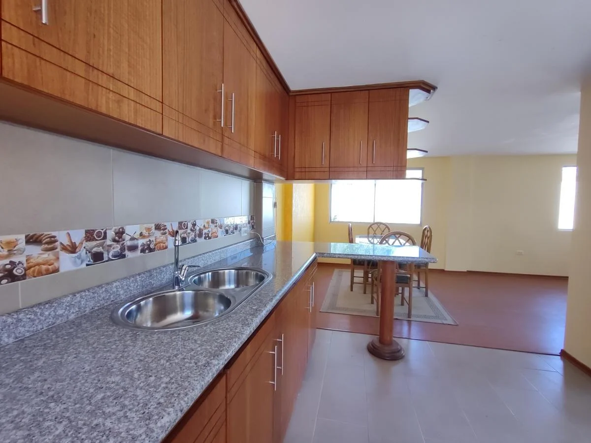 Cocina equipada con muebles altos y bajos, mesones de granito y un desayunador.