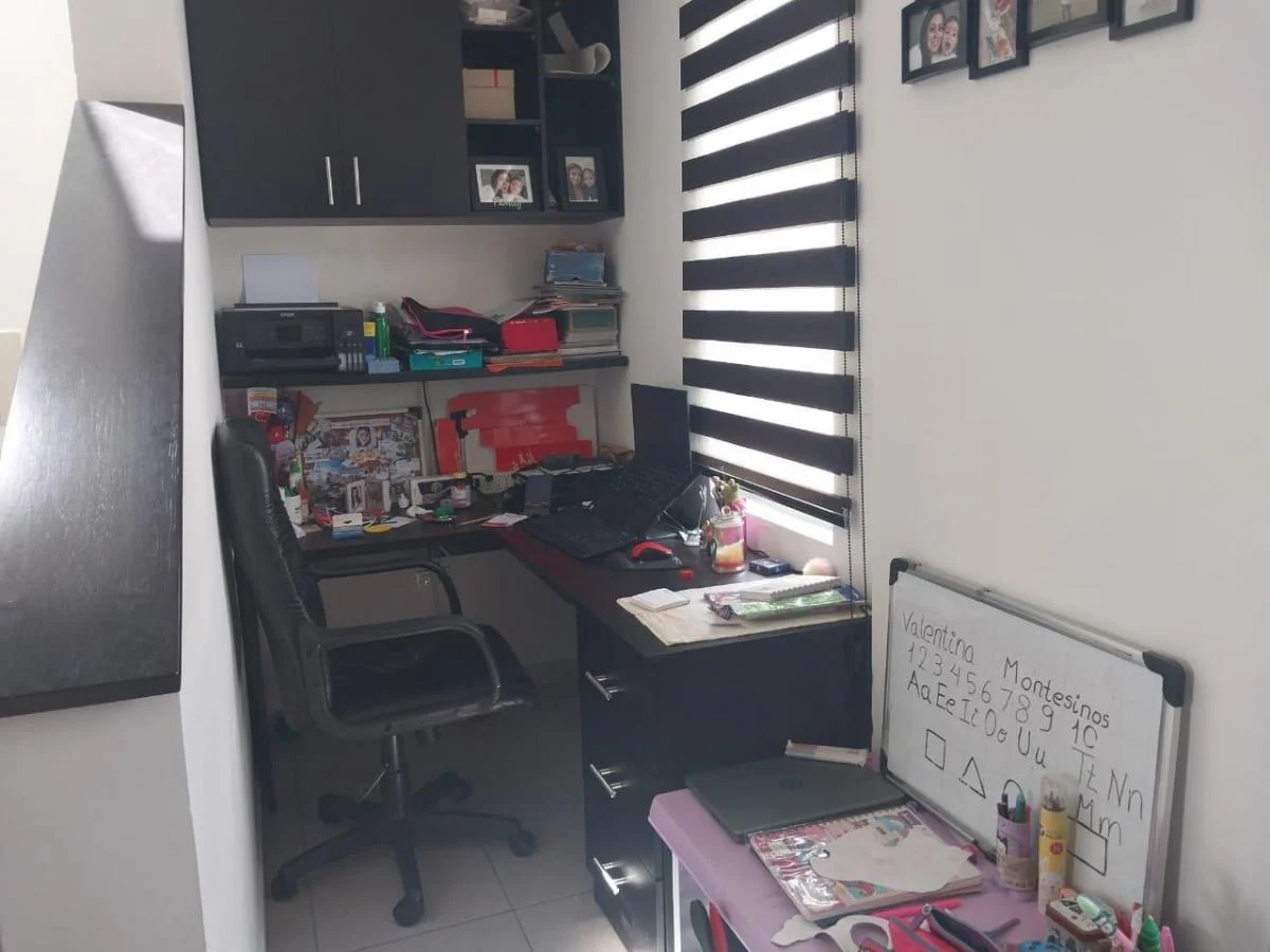 amplia sala de estar con una pequeña oficina o área de trabajo