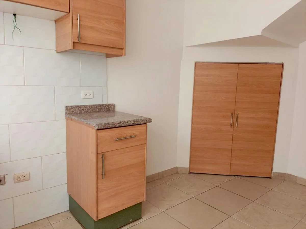 Cocina con muebles altos y bajos con una pequeña bodega