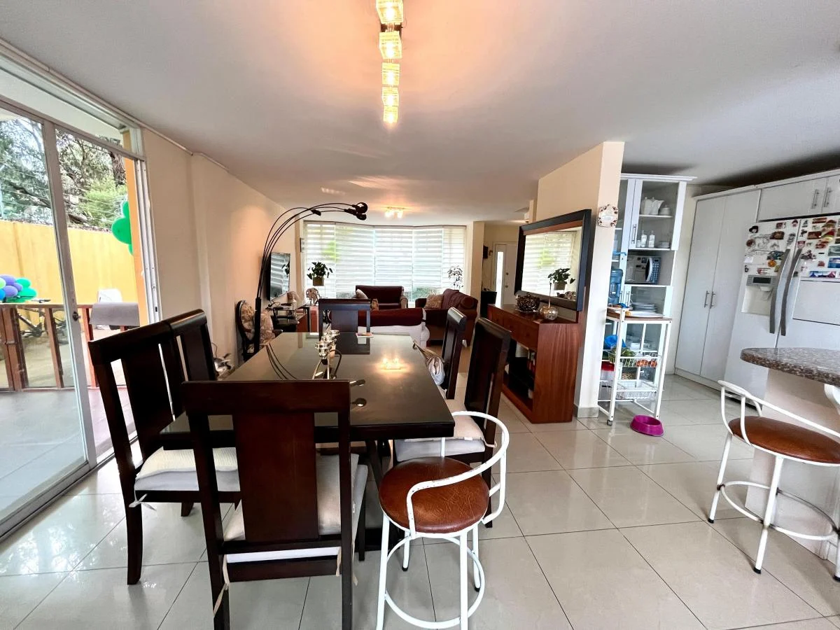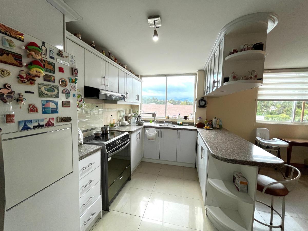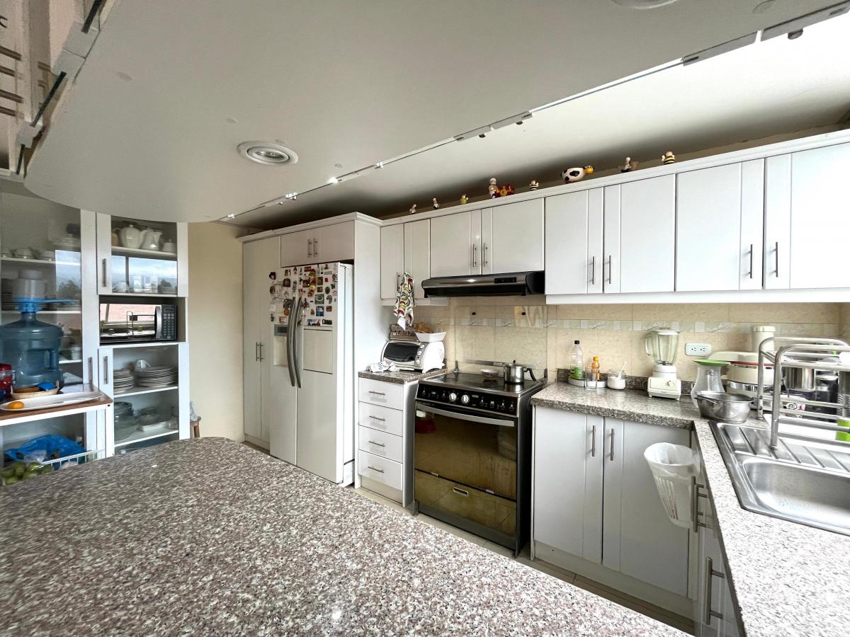 -Cocina con muebles altos y bajos, excelente ventilación e iluminación, desayunador con mesón de granito