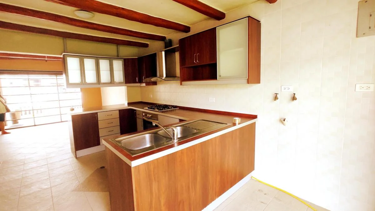 Cocina amplia con desayunador con muebles bajos y altos, horno empotrado, encimeta y campana extractora.