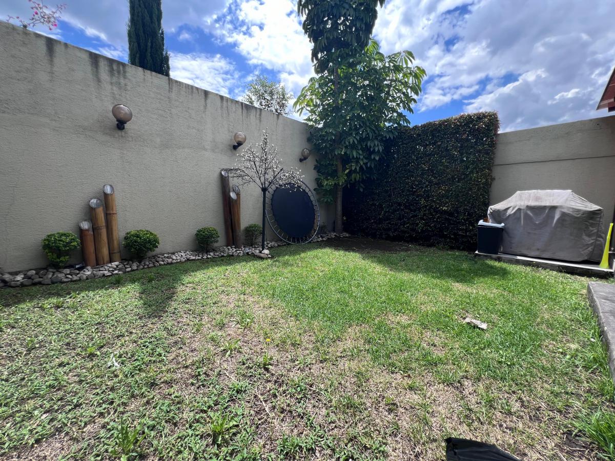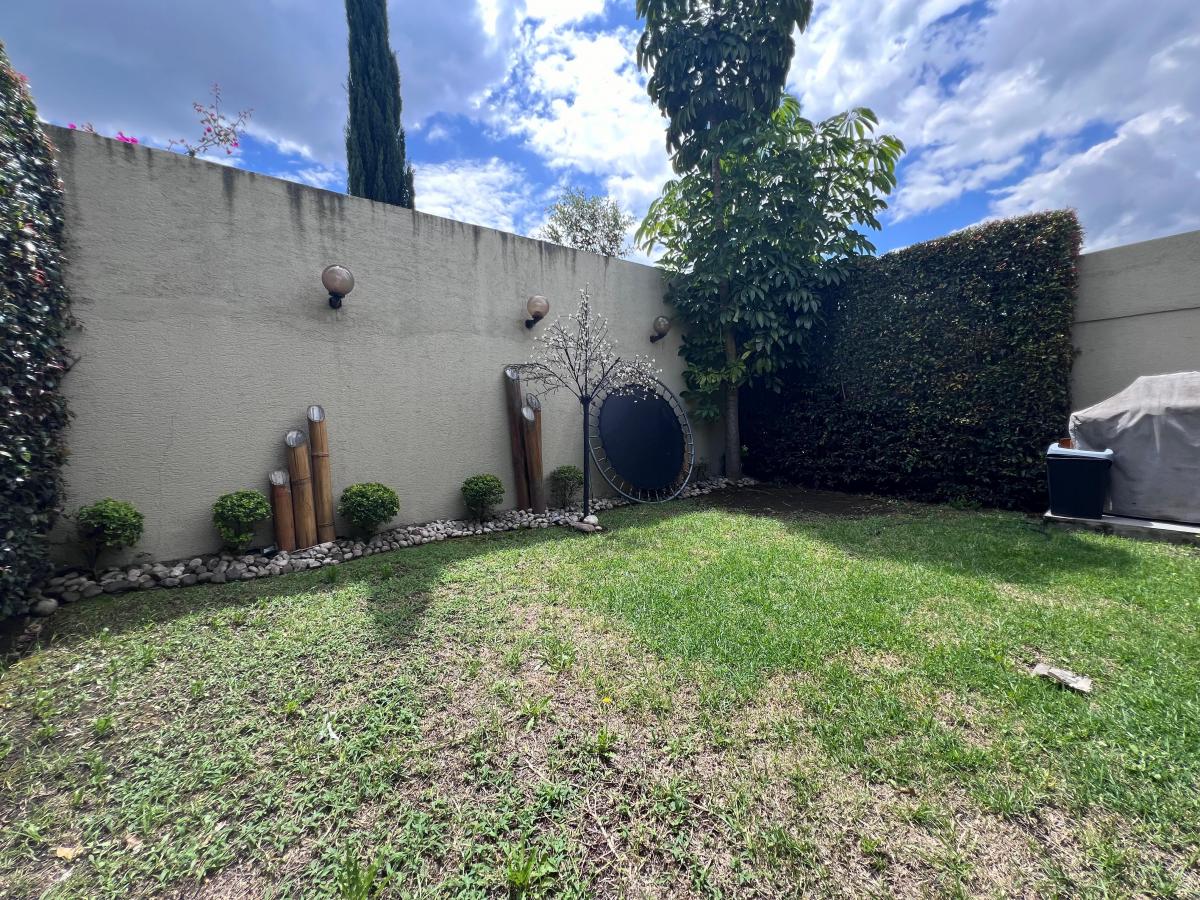 – Jardín con pérgola ideal para una sala y comedor de exterior.