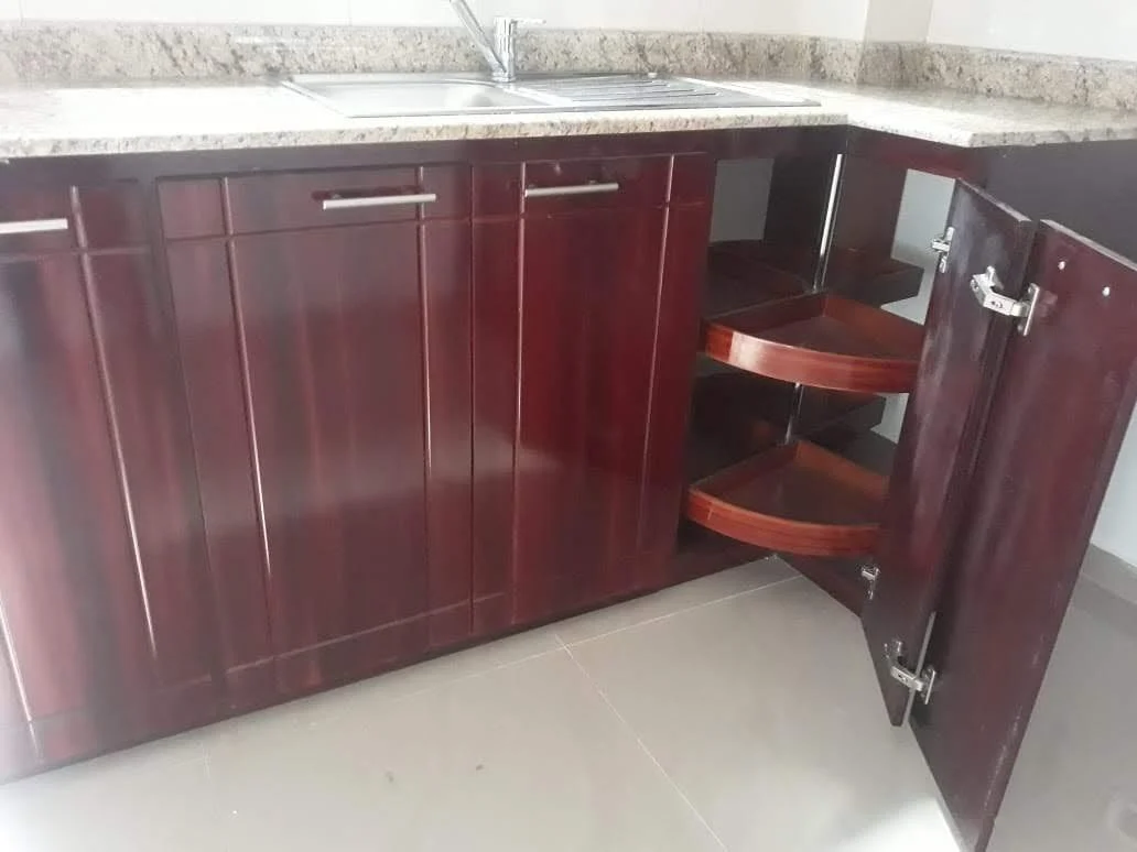 Cocina estilo americano con muebles empotrados altos y bajos.