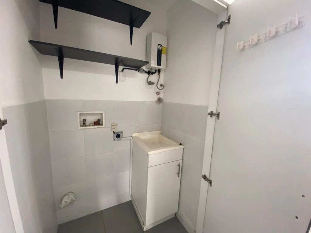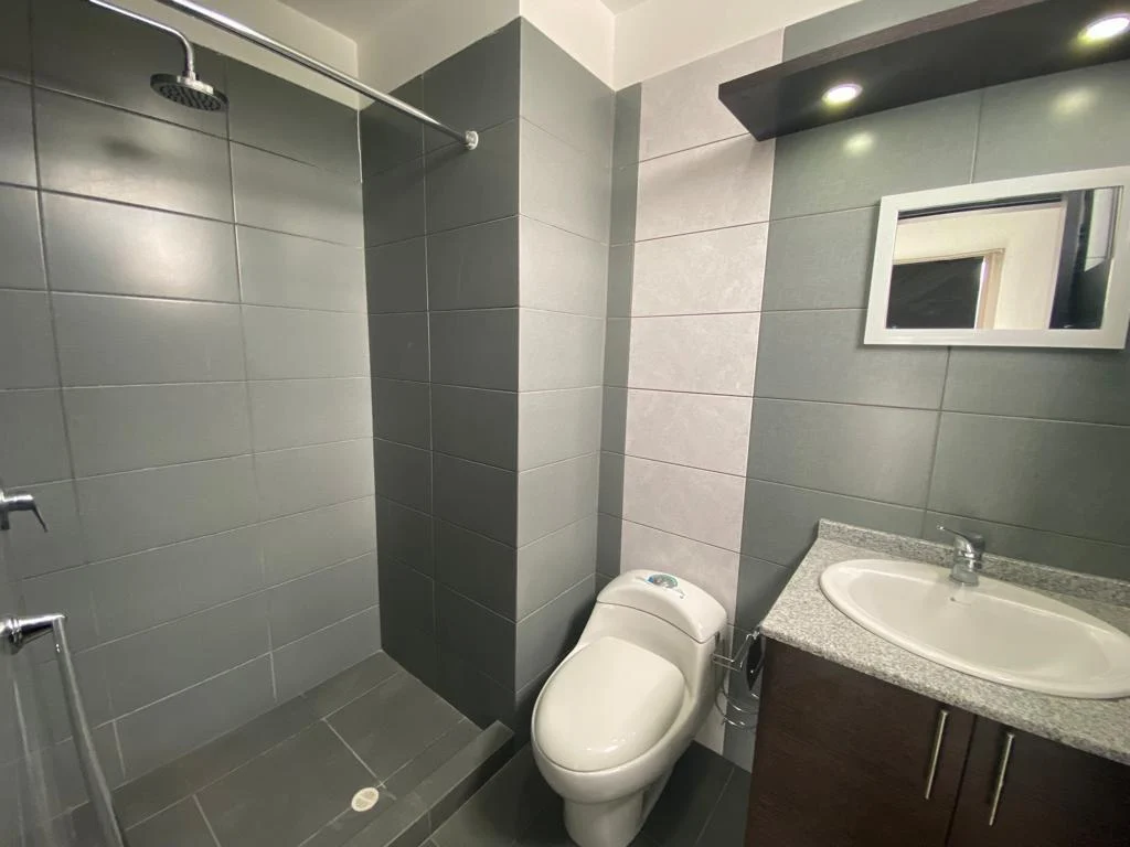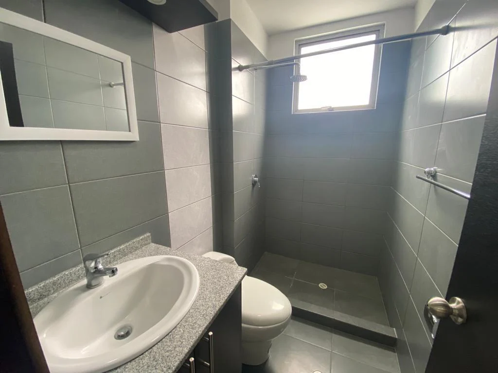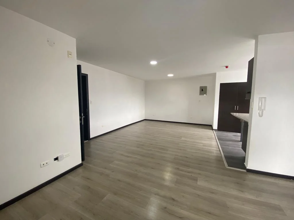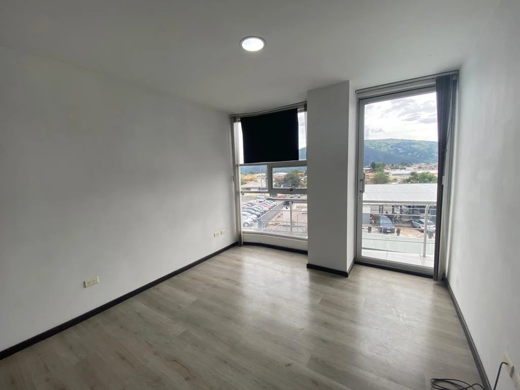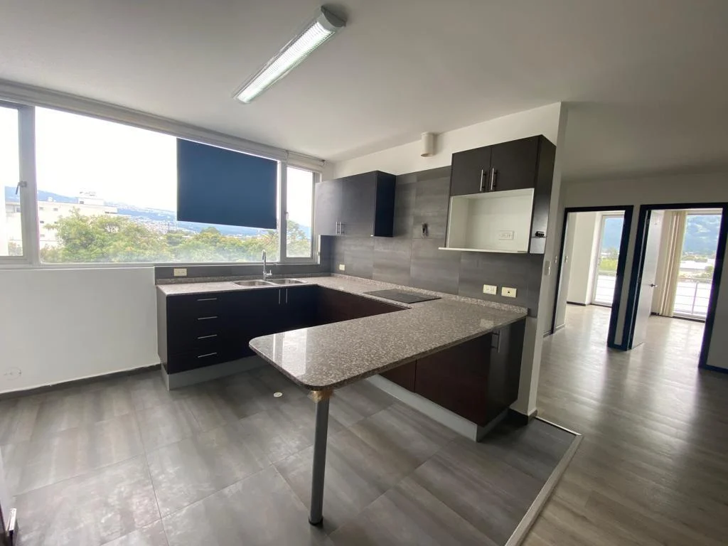 Dos habitaciones con balcón y amplios ventanales que permiten la entrada de luz natural, sala, comedor y cocina en un mismo ambiente, 2 baños completos, área de máquinas con instalaciones 110-220, 1 parqueadero.