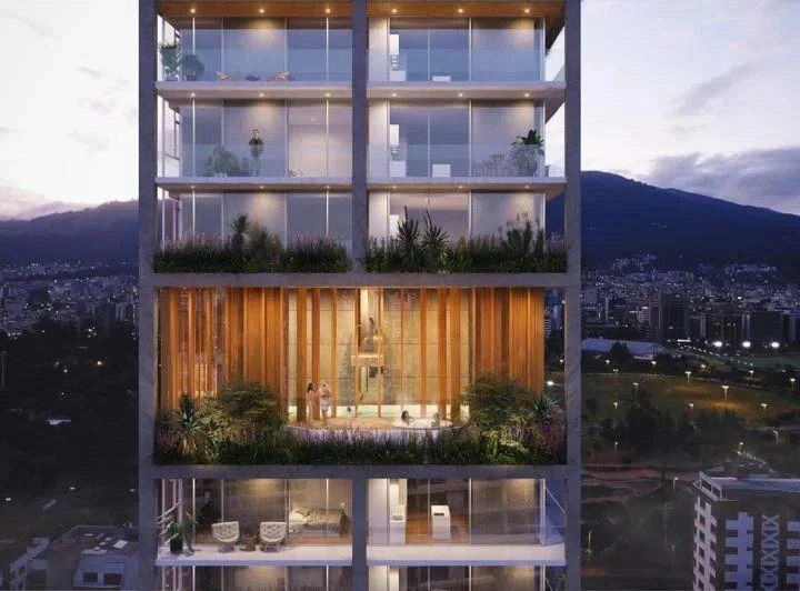 Es un proyecto que parte de una concepción urbana importante, donde aprovecha su condición esquinera en una de las zonas más activas de Quito, para conectarse con la ciudad y con el peatón, creando un espacio urbano arborizado que da vida a la AVENIDA REPÚBLICA DEL SALVADOR mediante áreas exteriores, que se conectan con las áreas comerciales del edificio, potencializando el movimiento y la vida en la ciudad.